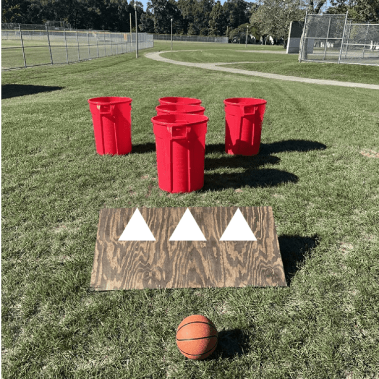 Giant Skee-ball uses giant 32-gallon bins, a basketball, and a ramp to turn the classic arcade game into a life-size version.